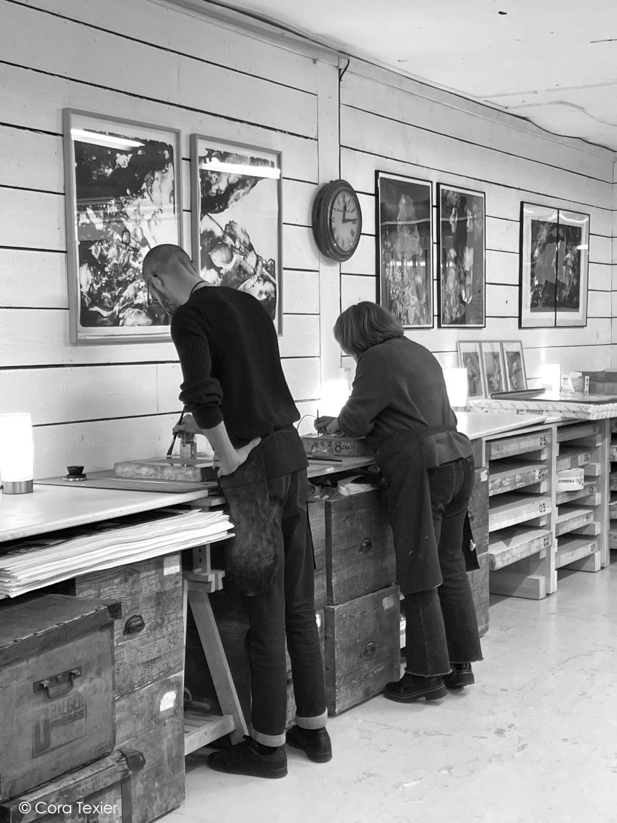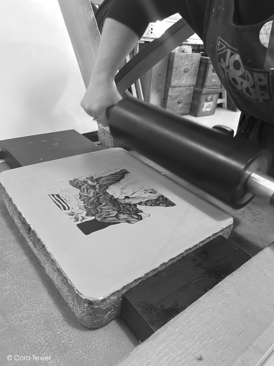 En 2014 Cora découvre la technique de la lithographie aux Ateliers de la Ville de Paris en 2017, elle acquiert un fond d’atelier, une presse à bras lithographique, des pierres.